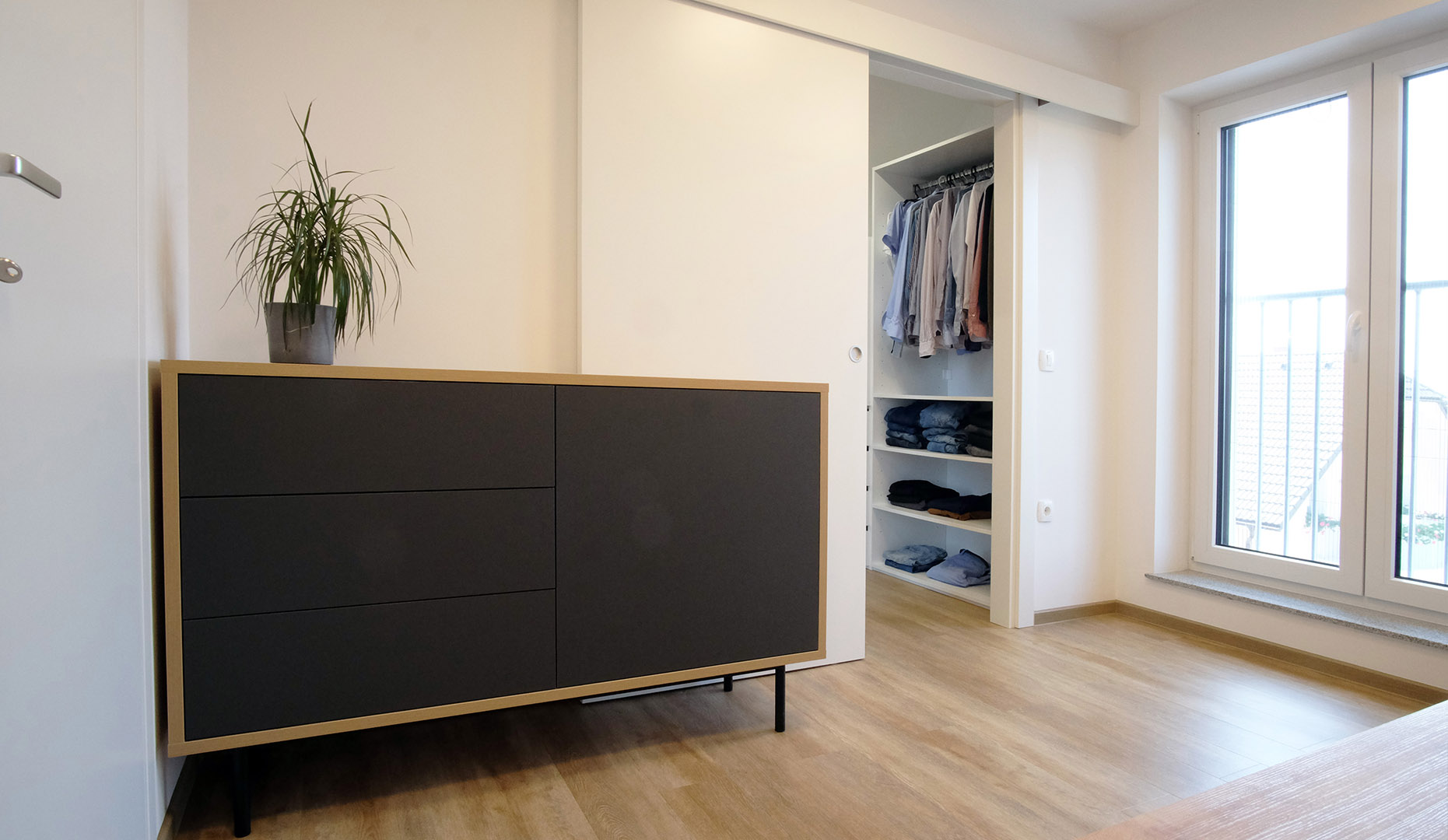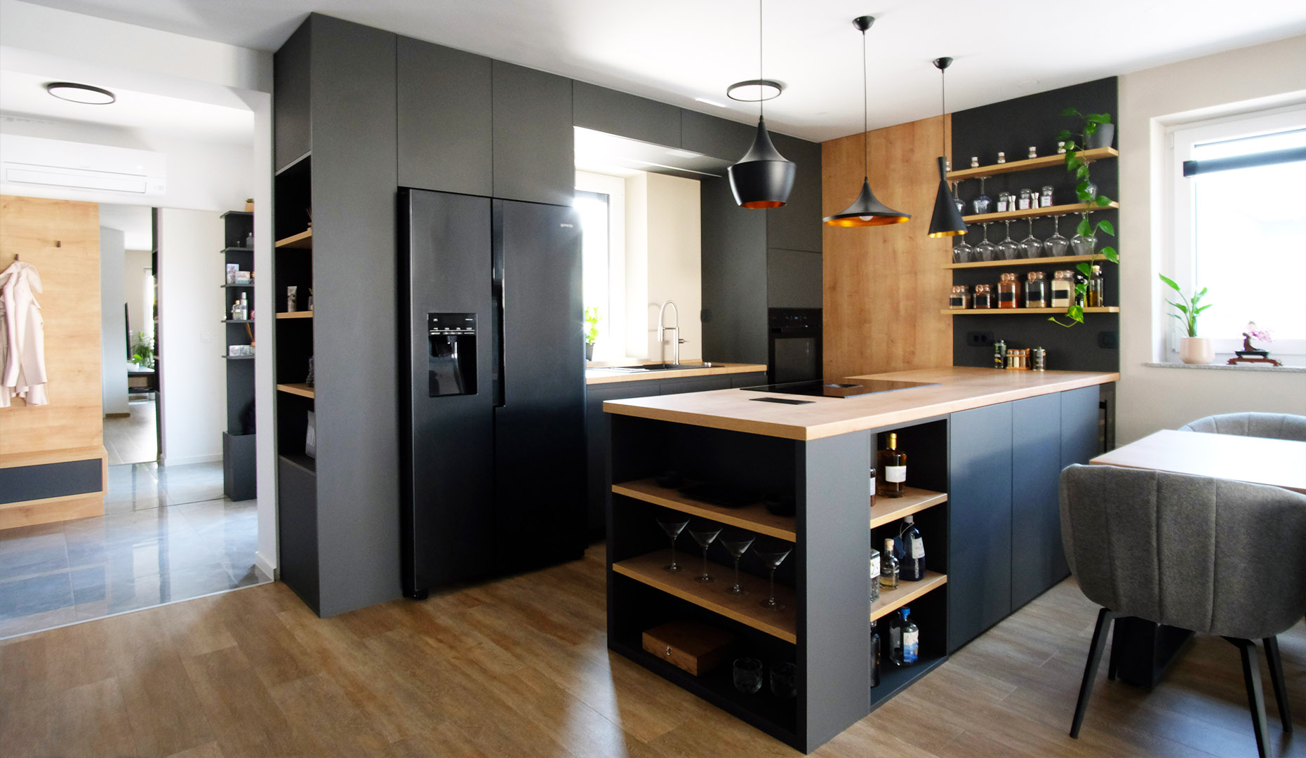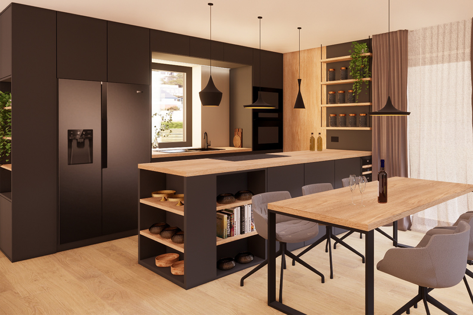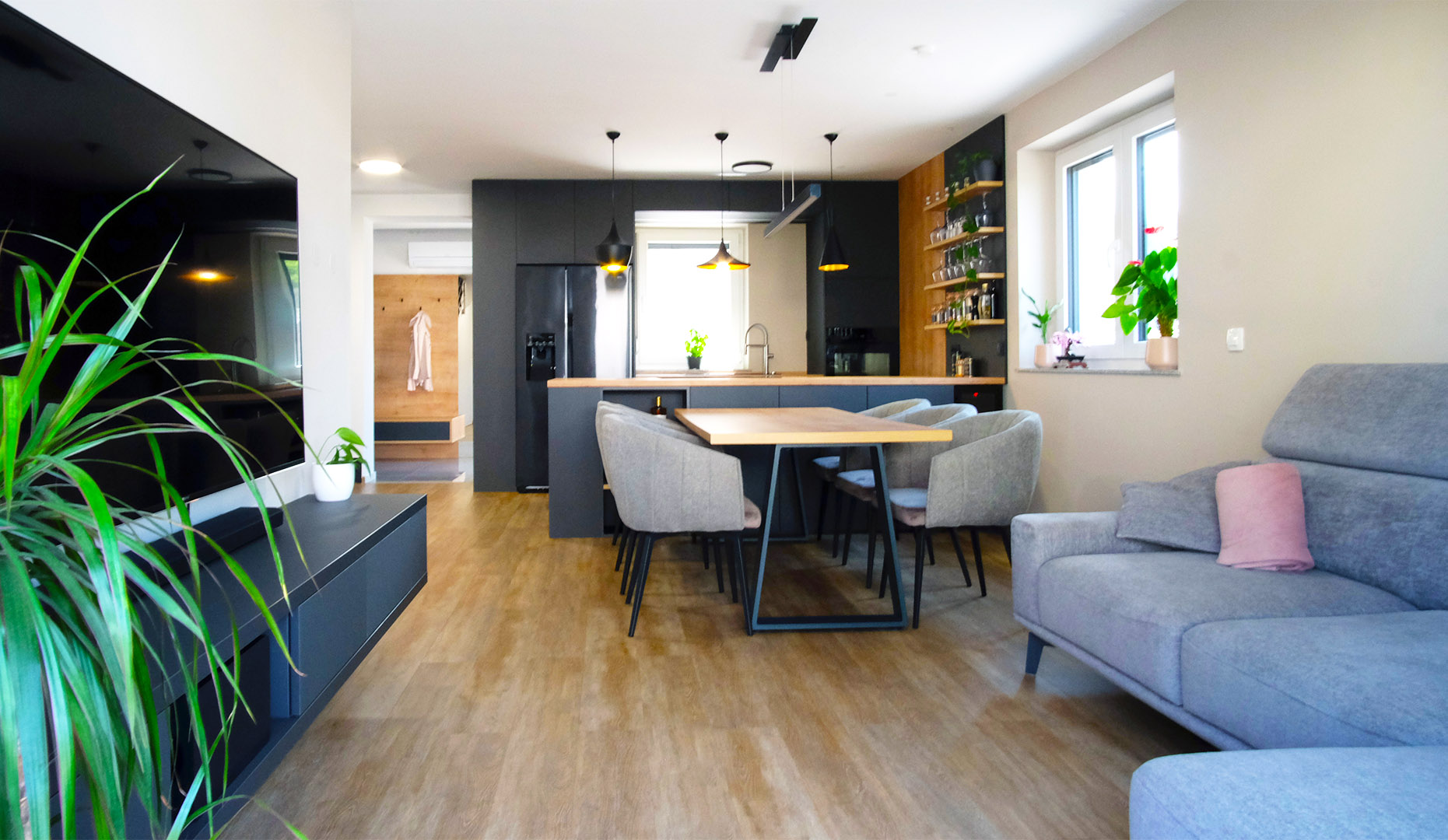 Naročnika sta nas kontaktirala ob nakupu ene enote novozgrajenega dvojčka. Objekt je bil še v zaključnih fazah gradnje, tako da smo imeli možnost za določene manjše spremembe. Hitro smo se lotili idejne zasnove glavnih prostorov, da so lahko izvajalci dokončali enoto po naših predlogah. Skupaj z naročnikoma smo izbrali vinilno talno oblogo, izvajalcem pa smo predali načrte s spremenjenimi pozicijami vtičnic, v tej fazi smo tudi razširili zunanjo teraso.