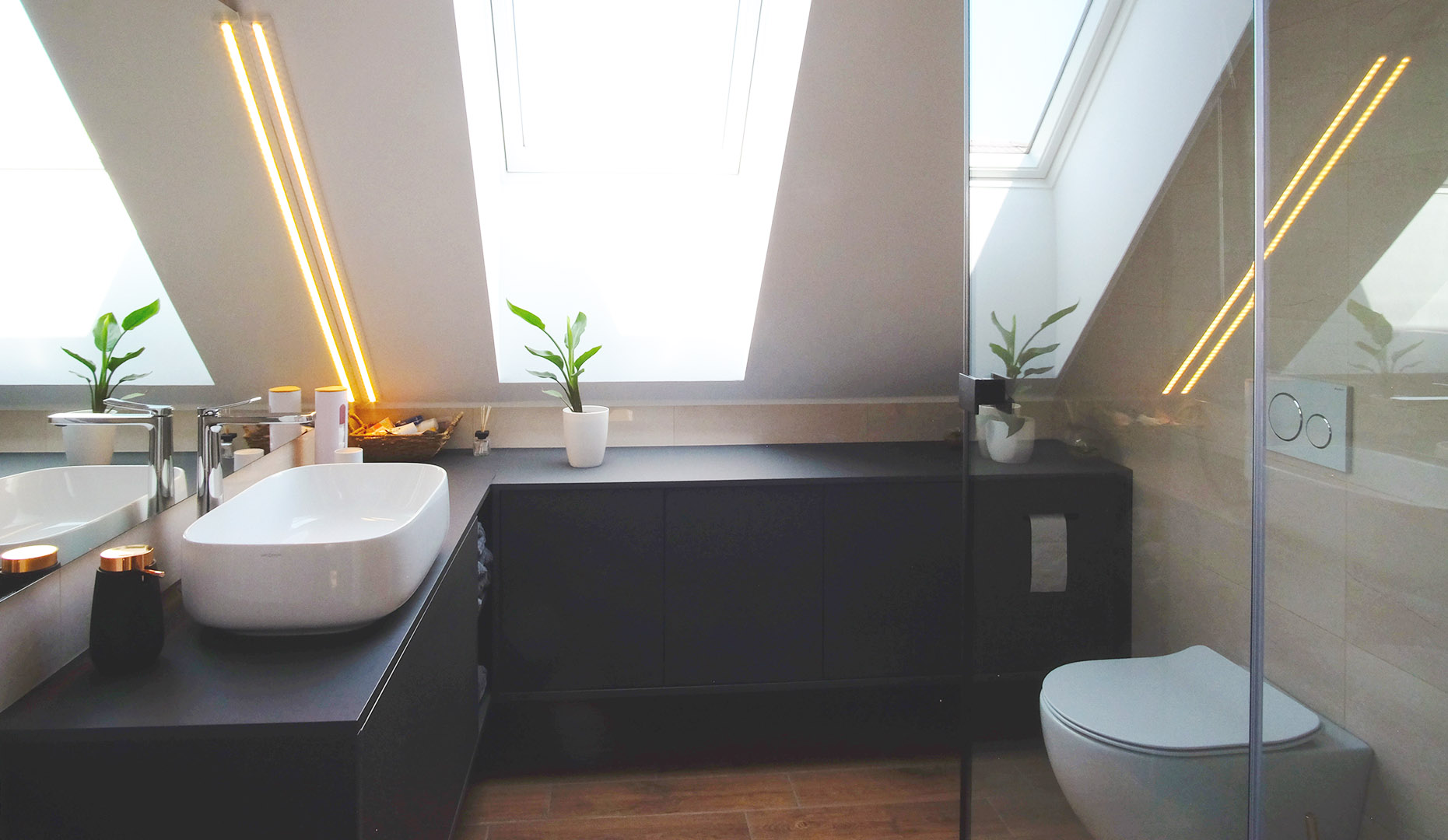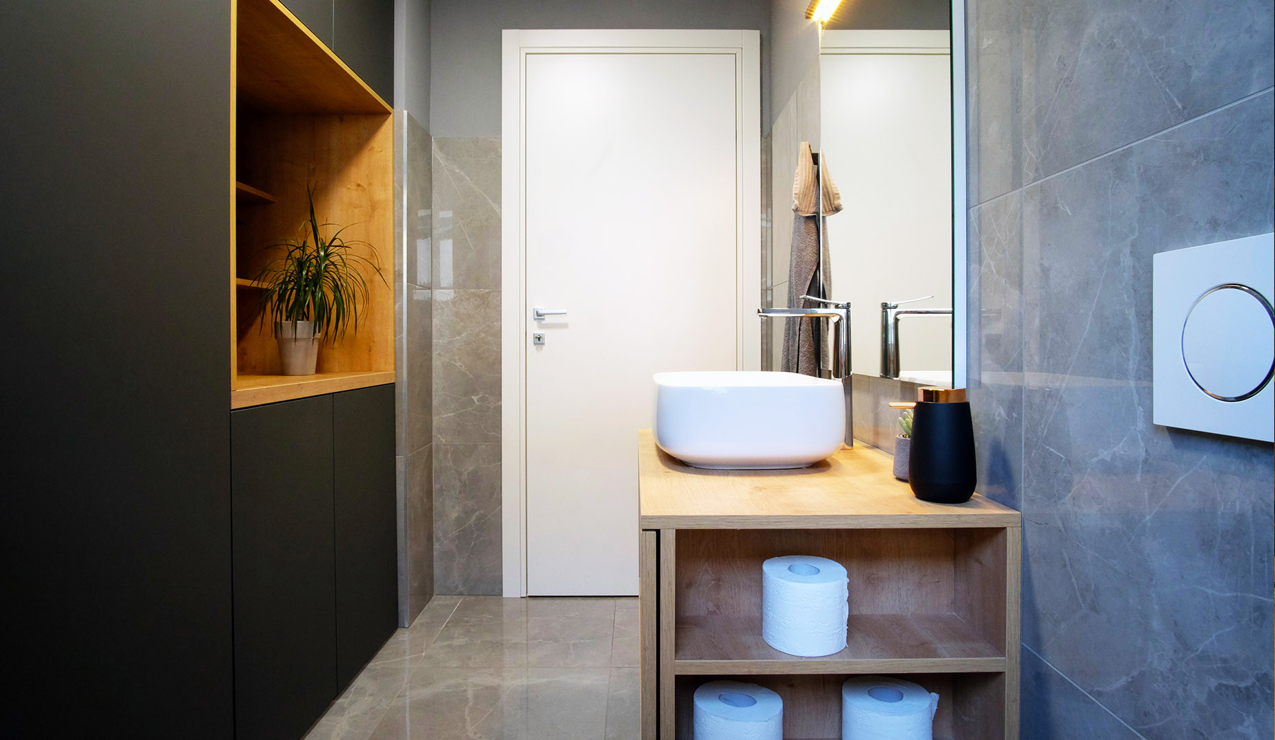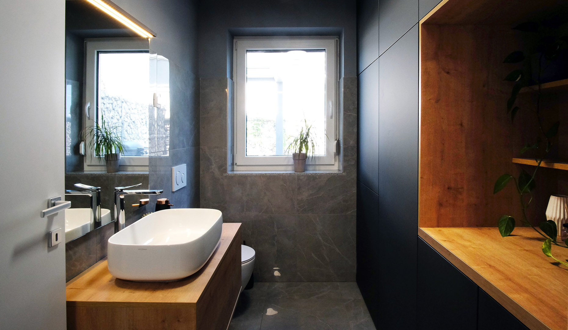 V pritličju so bile v istem prostoru predvidene sanitarije, utiliti in tehnični prostor z notranjo enoto toplotne črpalke. Pralni in sušilni stroj ter vse strojne naprave in cevi smo skrili v omaro, tako da je prostor reprezentativen, tudi ko ga uporabljajo gostje. Celotna oprema je zasnovana v kombinaciji grafitno sivega dekorja in hrastovega lesa, ki jo dopolnjujejo stene v toplih tonih.