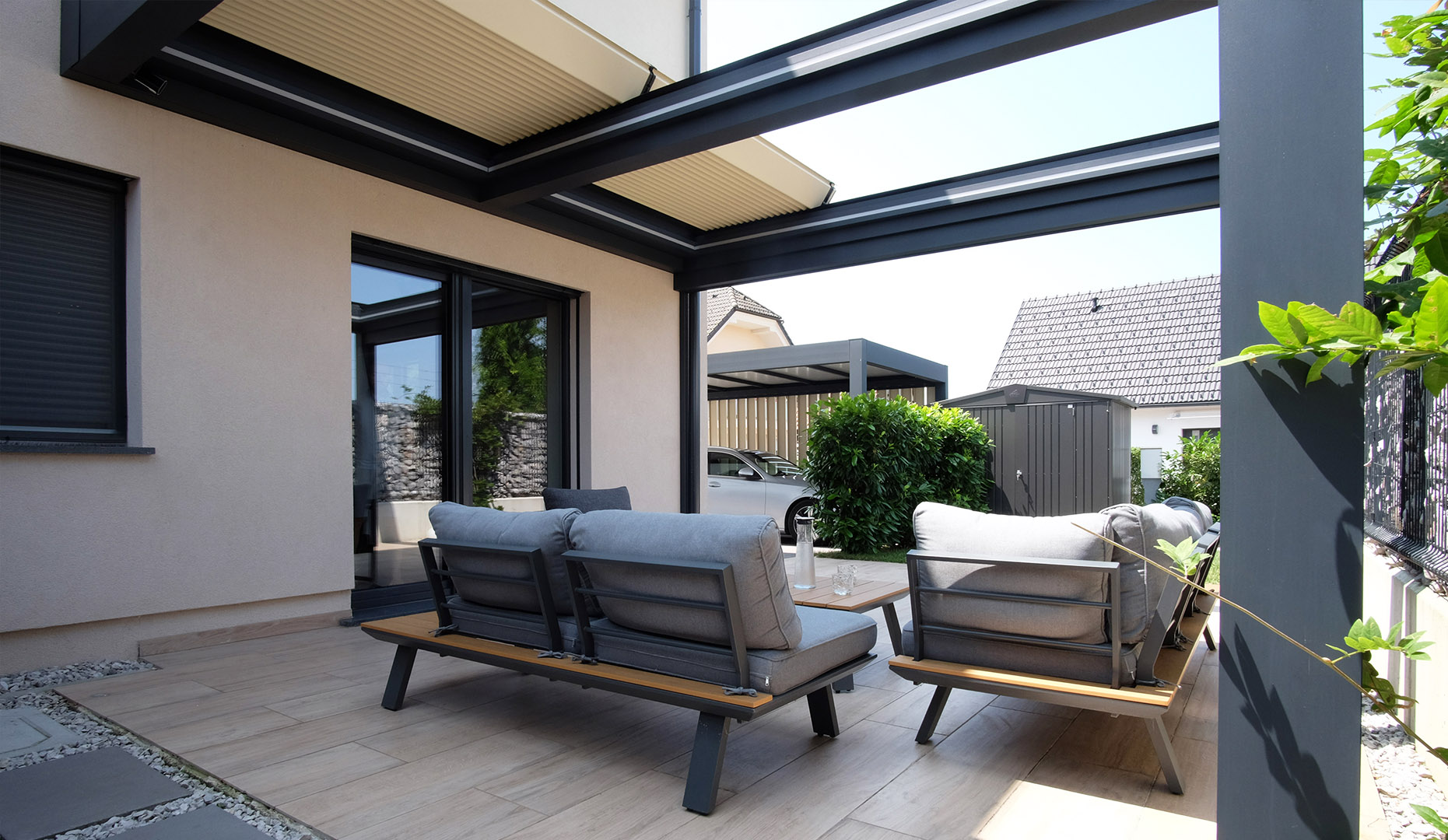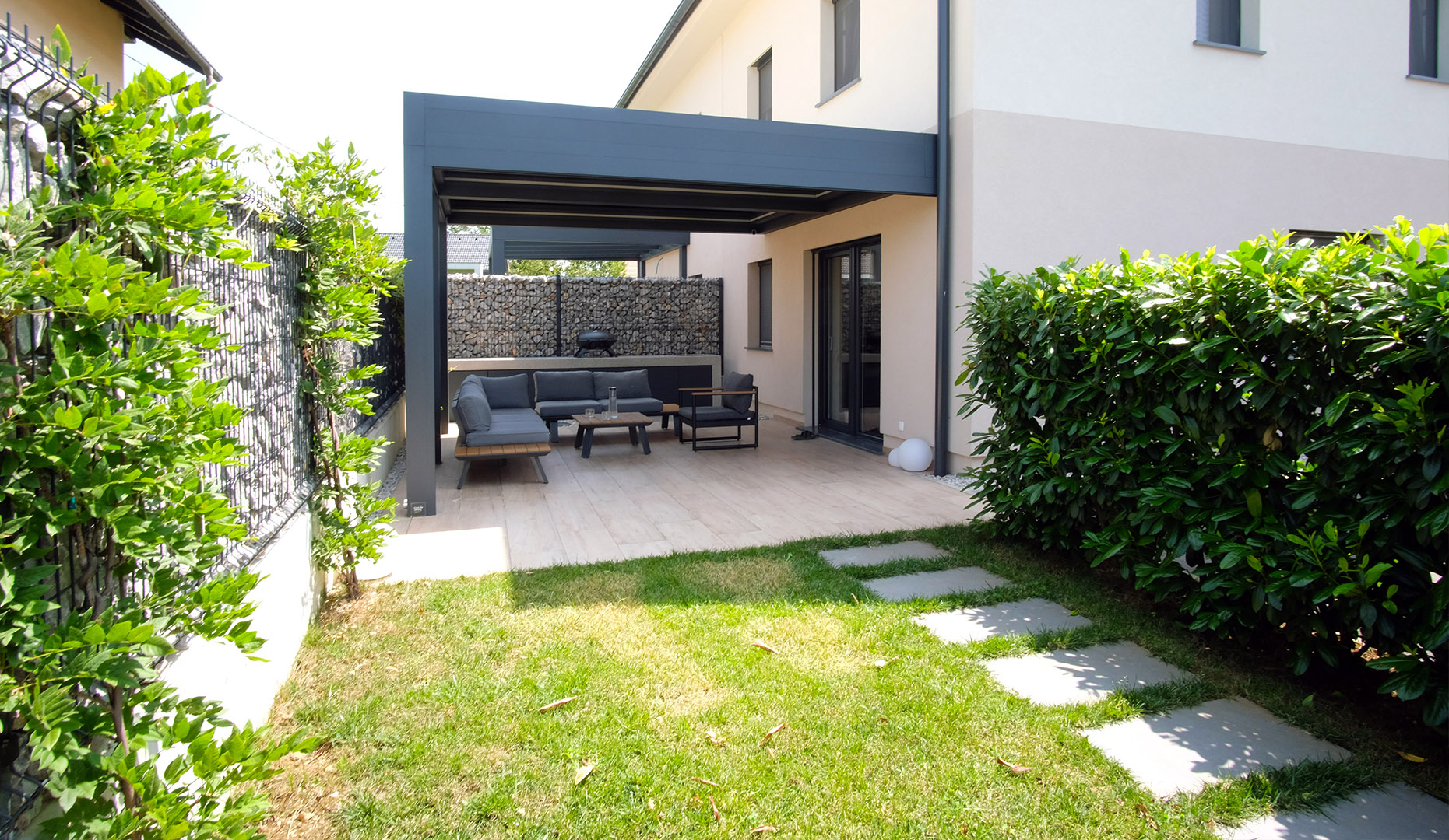 Oblikovali smo tudi okolico in zunanjo ureditev z nadstreškom za avto, letno kuhinjo v vidnem betonu ter teraso z bioklimatsko pergolo, ki nudi senco in je naročnikoma najljubši prostor za preživljanje poletnih dni in večerov.