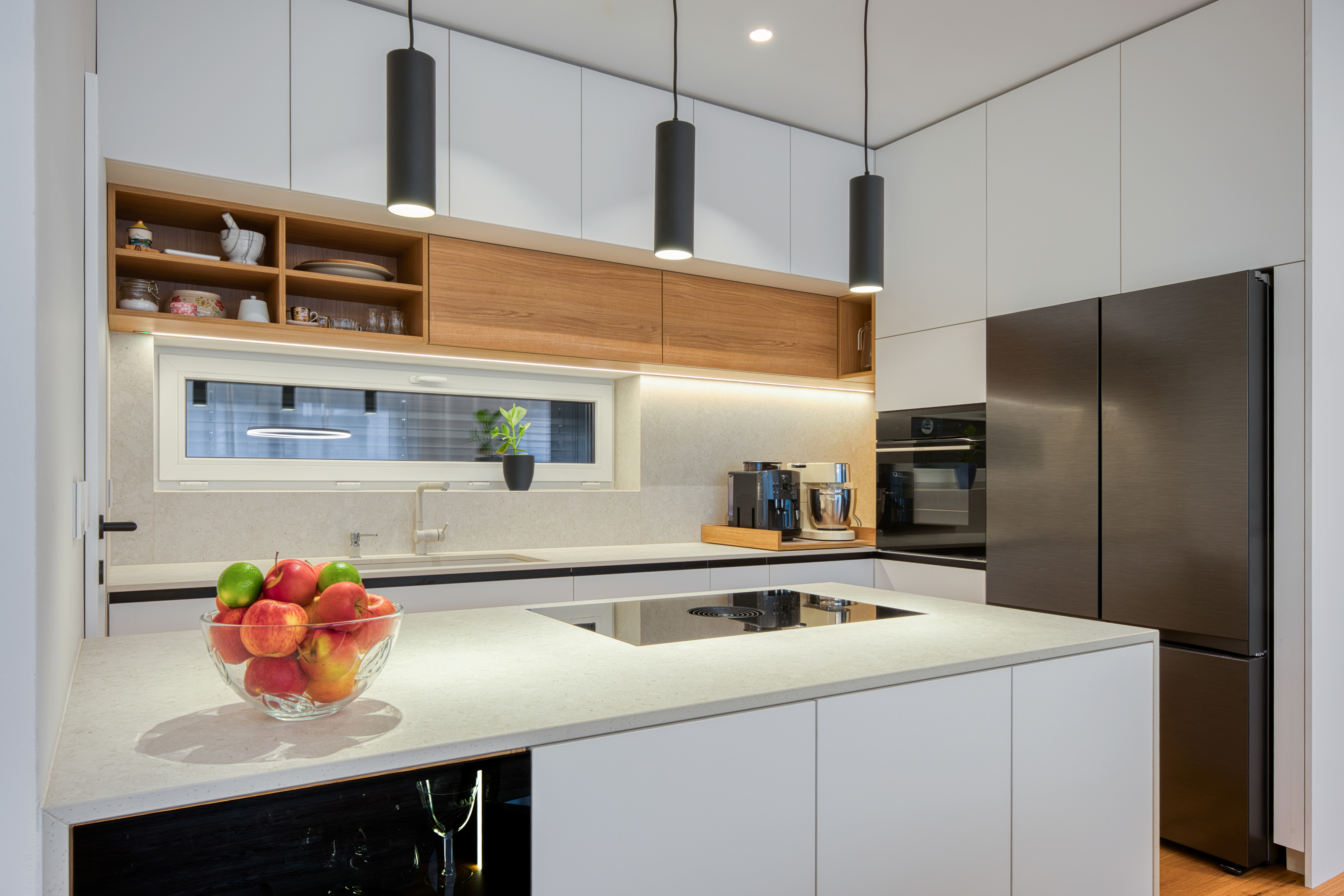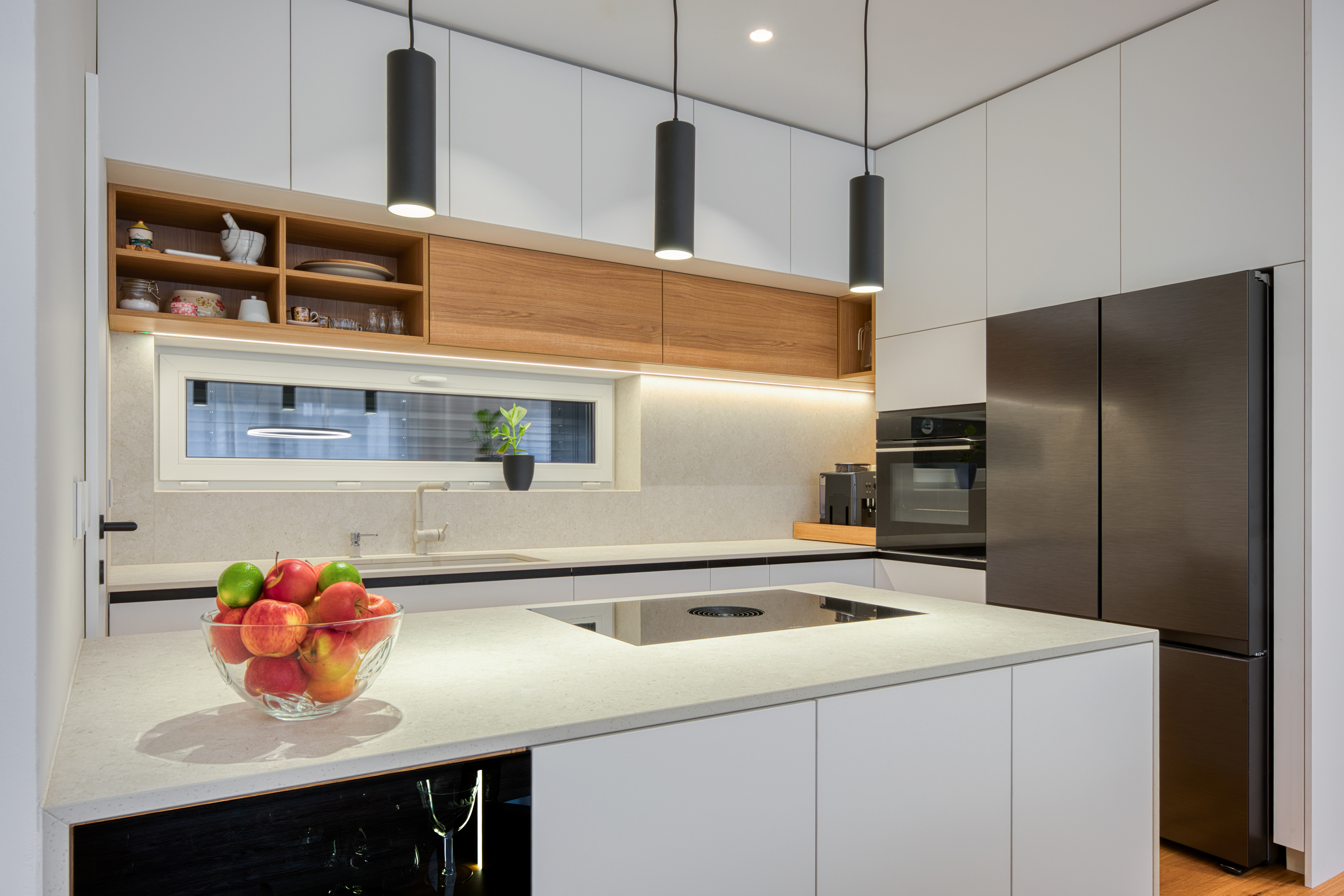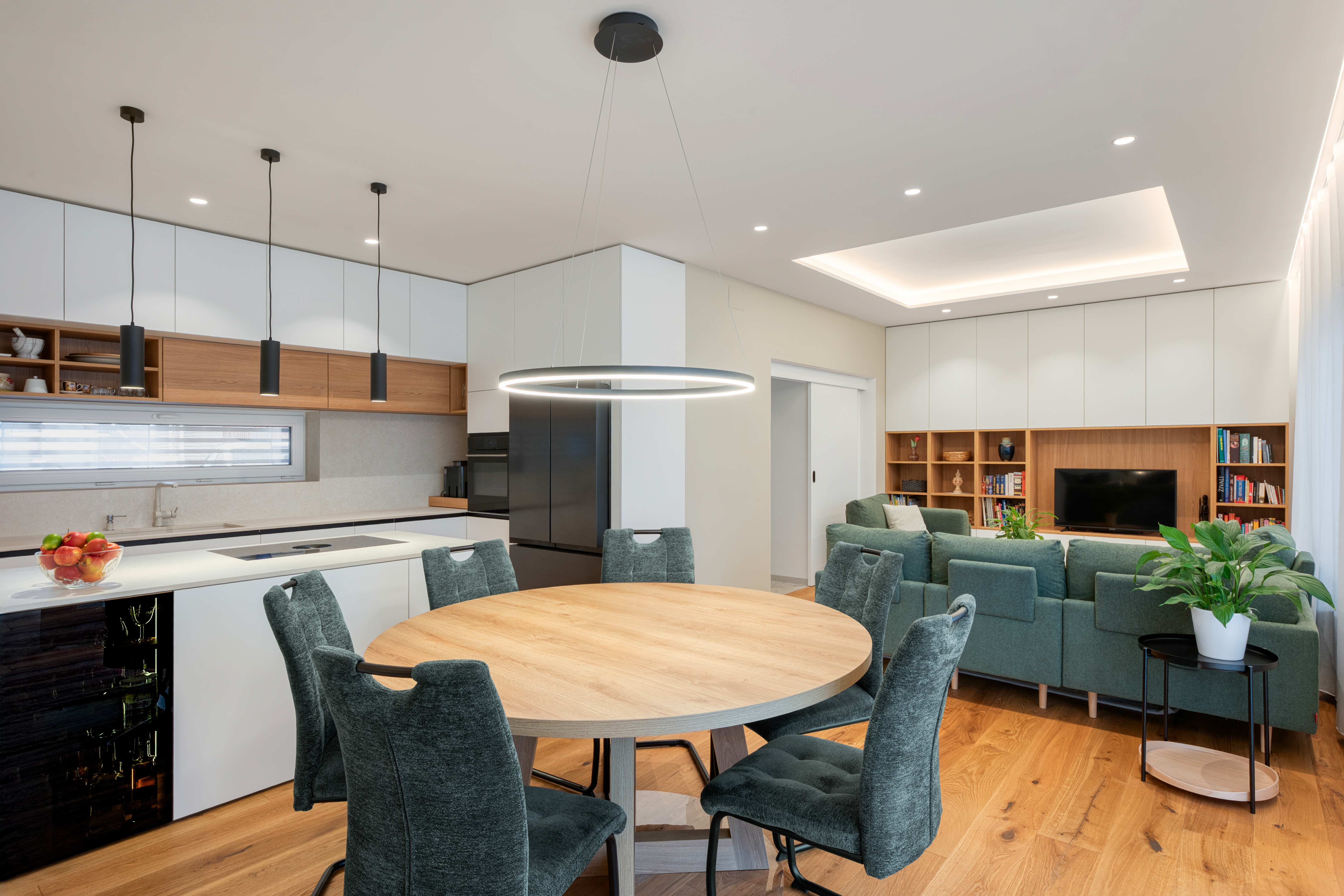 Štiričlanska družina si je v novogradnji na obrobju Ljubljane zaželela umirjen in udoben interier. Oblikovali smo opremo v nevtralnih svetlih tonih v kombinaciji s hrastom in jo dopolnili z mehkim oblazinjenim pohištvom. Ambientalna svetloba in zavese v dnevnih prostorih pričarajo udobno in domače zatočišče.