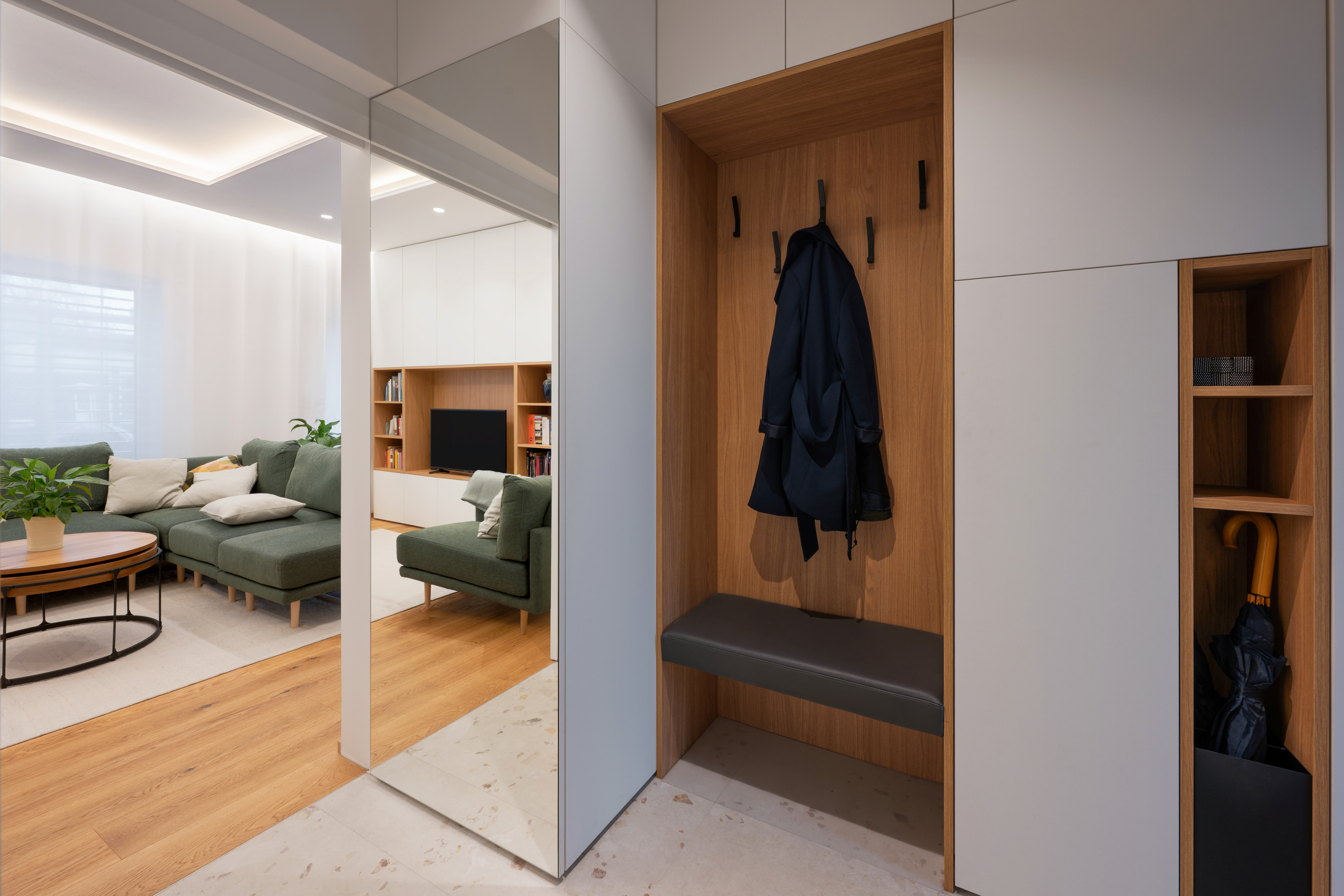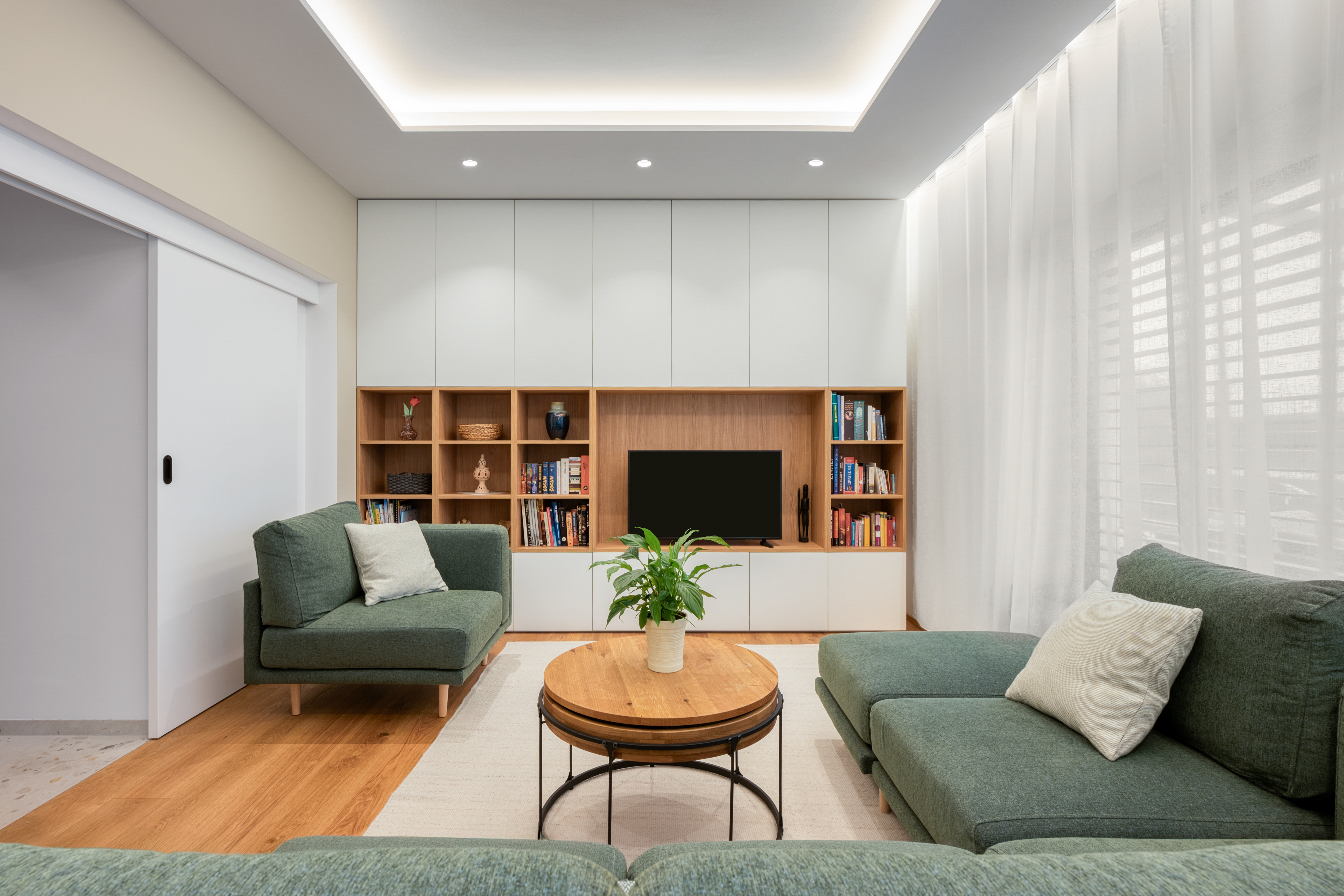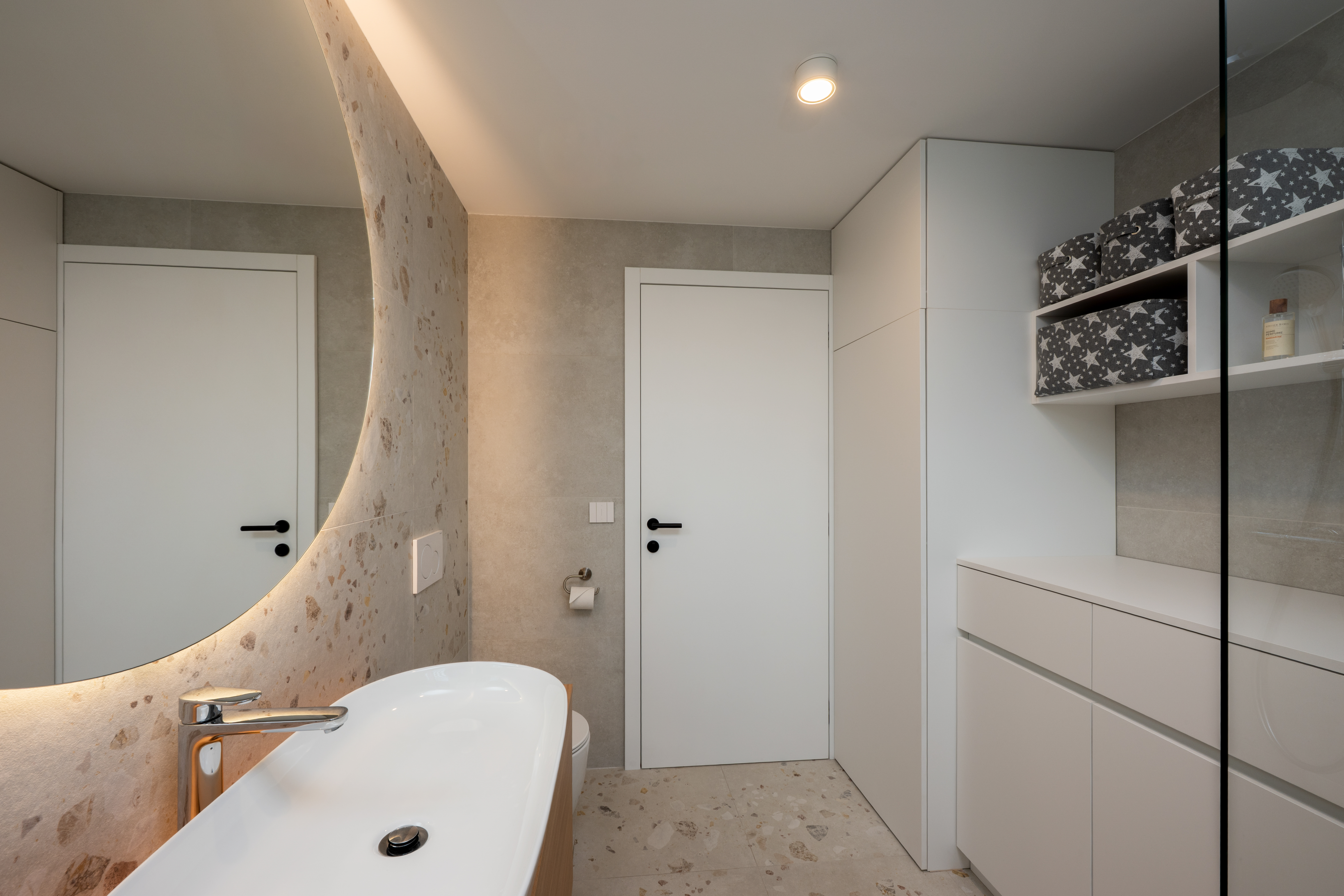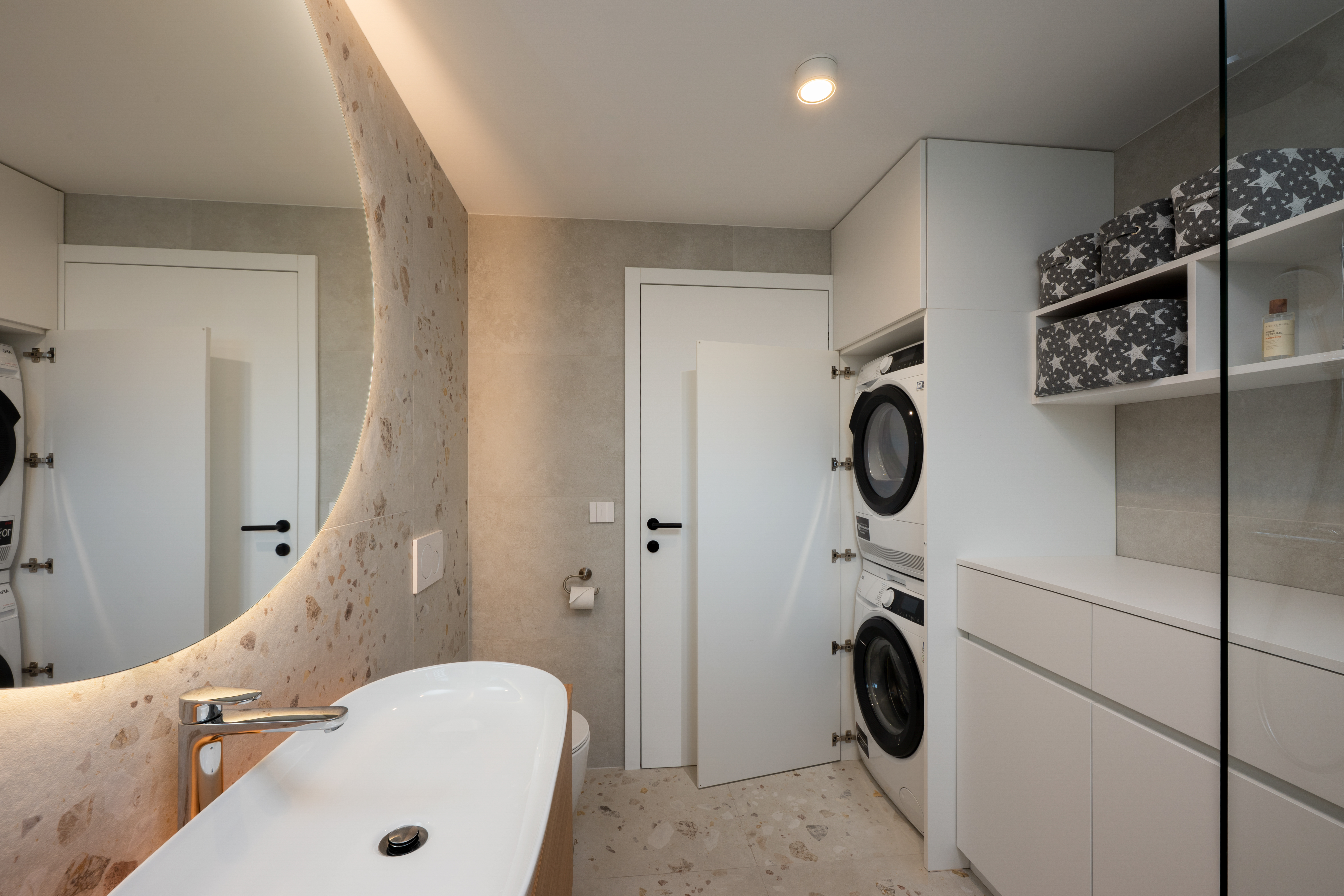 Štiričlanska družina si je v novogradnji na obrobju Ljubljane zaželela umirjen in udoben interier. Oblikovali smo opremo v nevtralnih svetlih tonih v kombinaciji s hrastom in jo dopolnili z mehkim oblazinjenim pohištvom. Ambientalna svetloba in zavese v dnevnih prostorih pričarajo udobno in domače zatočišče.